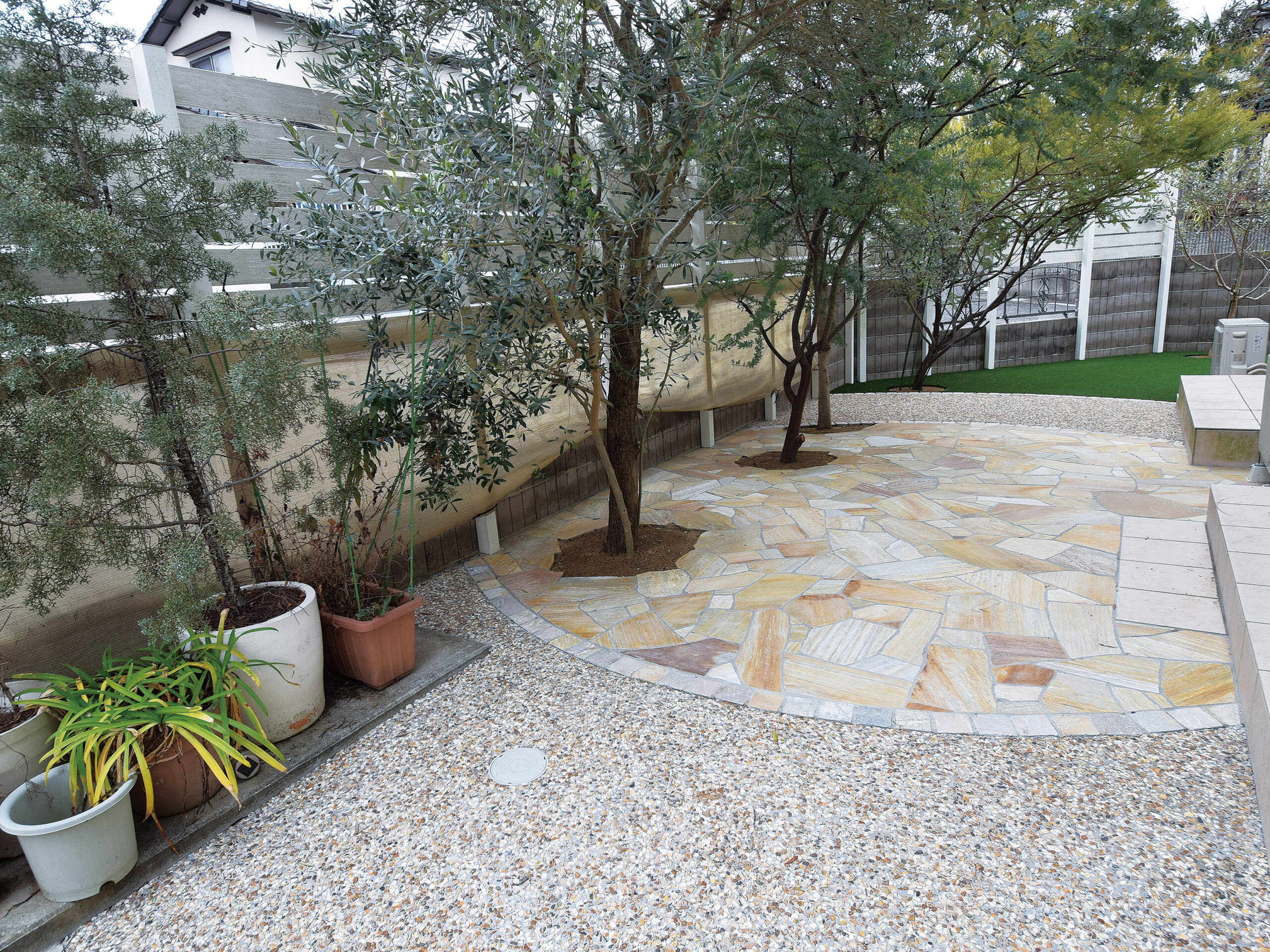 奥からサークル状に敷いた人工芝、豆砂利、天然石。異なる素材を使用する事でお庭の良いアクセントになっています。