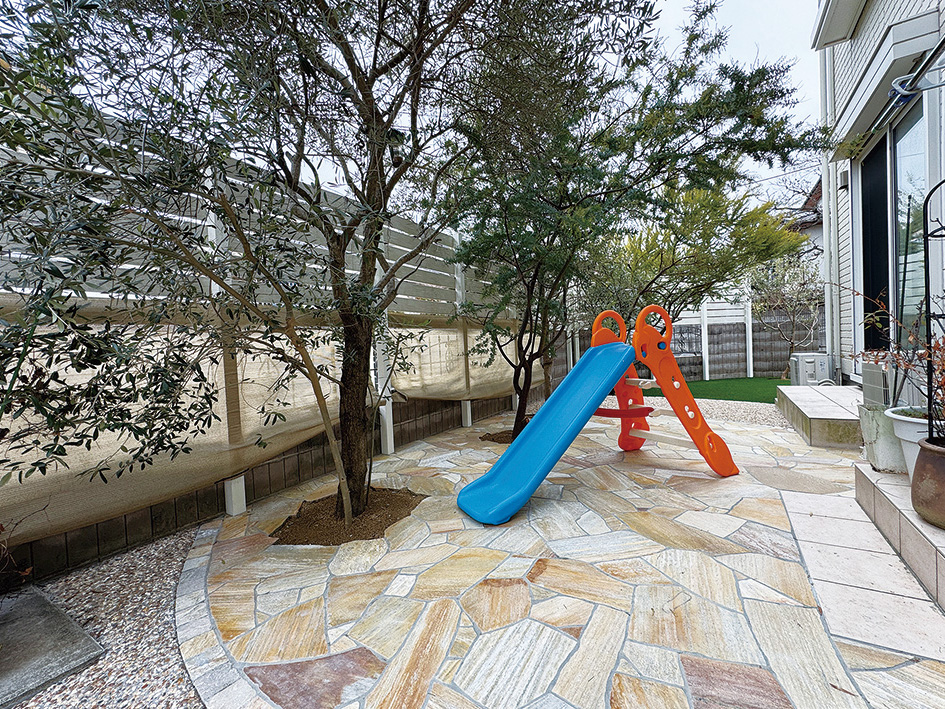 フラットな地面でお子様の遊具も置けるようになり、お庭で安心して遊べるようになりました。