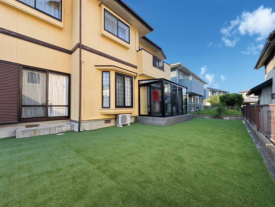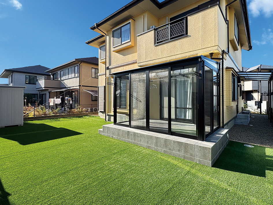 長年悩みの種だったお庭の雑草は全て人工芝に変える事でノーメンテナンスのお庭を実現。水はけも良く一年中キレイなグリーンを保てるようになり、広々したお庭のスペースを家族で思いきり楽しめるようになりました。