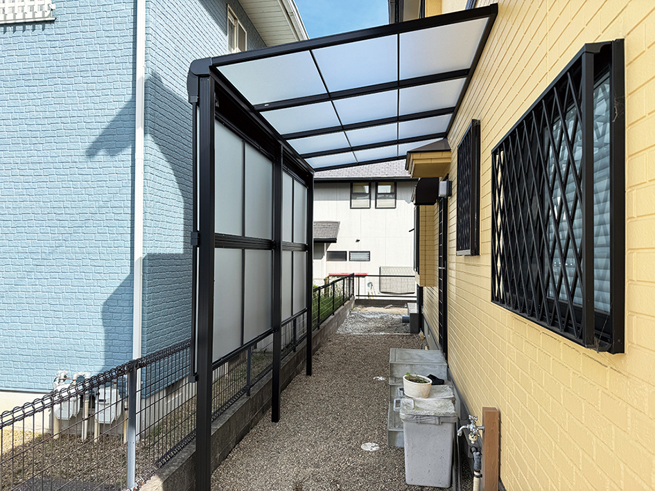 まず始めに経年劣化が目立っていたウッドデッキを撤去し、雨風に強く掃除もしやすいタイルテラスを設置しました。その上に三協アルミ「晴れもようwith」を設置し、ランドリースペースを一新しました。